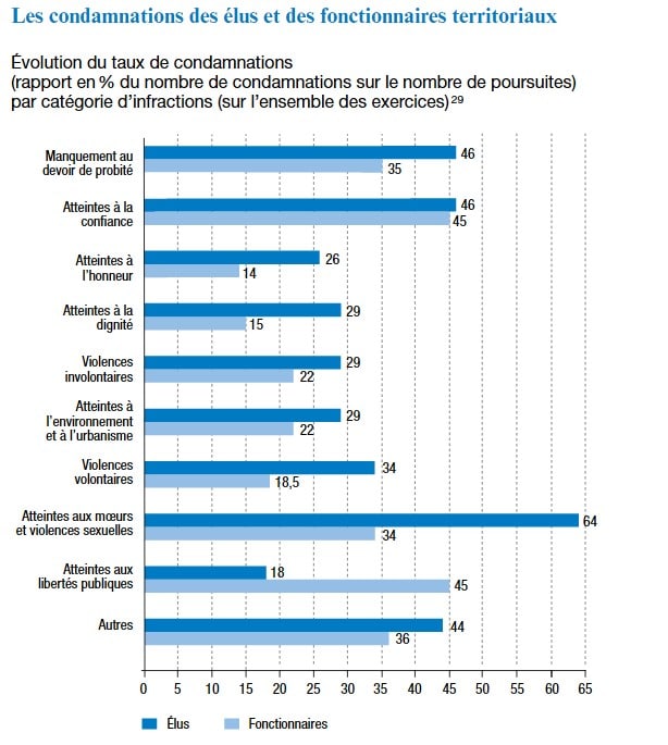Pendant la mandature 2008-2014, 44 % des élus locaux (171 personnes) et 48 % des fonctionnaires territoriaux (85 personnes) condamnés l’ont été pour des manquements au devoir de probité, avec une moyenne annuelle des condamnations en hausse, aussi bien pour les élus (+ 28 %) que pour les agents (+ 18 %). Le taux de condamnation des élus (46 %) est supérieur à celui des agents territoriaux (35 %) ; ce qui peut s’expliquer notamment par la prépondérance des poursuites engagées contre les élus pour prise illégale d’intérêts, à laquelle les fonctionnaires sont moins exposés.