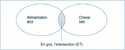 Afin de limiter les réponses à l'alimentation du cheval, il faut, au départ, relier les deux termes par ET, ce qui revient à rédiger une équation logique élémentaire : « alimentation ET cheval ». La réponse ne retiendra alors que ce qui est commun aux ensembles « cheval » et « alimentation », soit un nombre nécessairement égal ou inférieur à l'addition des deux (dans notre exemple, 76 réponses) ( cf. Fig. 1 ).