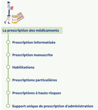 Placée sous la responsabilité du médecin et de certains professionnels de santé, la prescription des médicaments est l’étape initiale du circuit du médicament. L’enjeu de la démarche d’analyse est de vérifier :