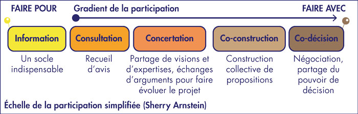 En 1969, la sociologue Sherry Arnstein a défini divers niveaux d’implication des citoyens dans les démarches participatives portées par les acteurs publics, destinées à associer ou substituer les électeurs aux élus dans la prise de décision publique. Leur nombre est aujourd’hui généralement ramené à 4, selon qu’ils conduisent à « faire pour » ou à « faire avec » le public.