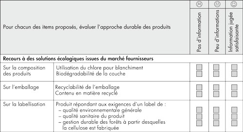 Il peut utiliser, à cet effet, le présent tableau afin d’évaluer les marges de progression pour améliorer l’aspect durable des produits.